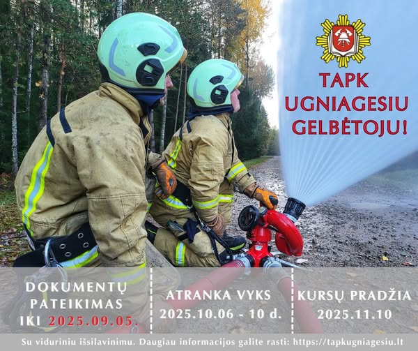 TAPK UGNIAGESIU GELBĖTOJU! Turintiems vidurinį išsilavinimą mokymų trukmė 6 mėnesiai. Jei esi ryžtingas ir drąsus, nori padėti kitiems – tapk ugniagesiu gelbėtoju! Dokumentų pateikimas iki ...
